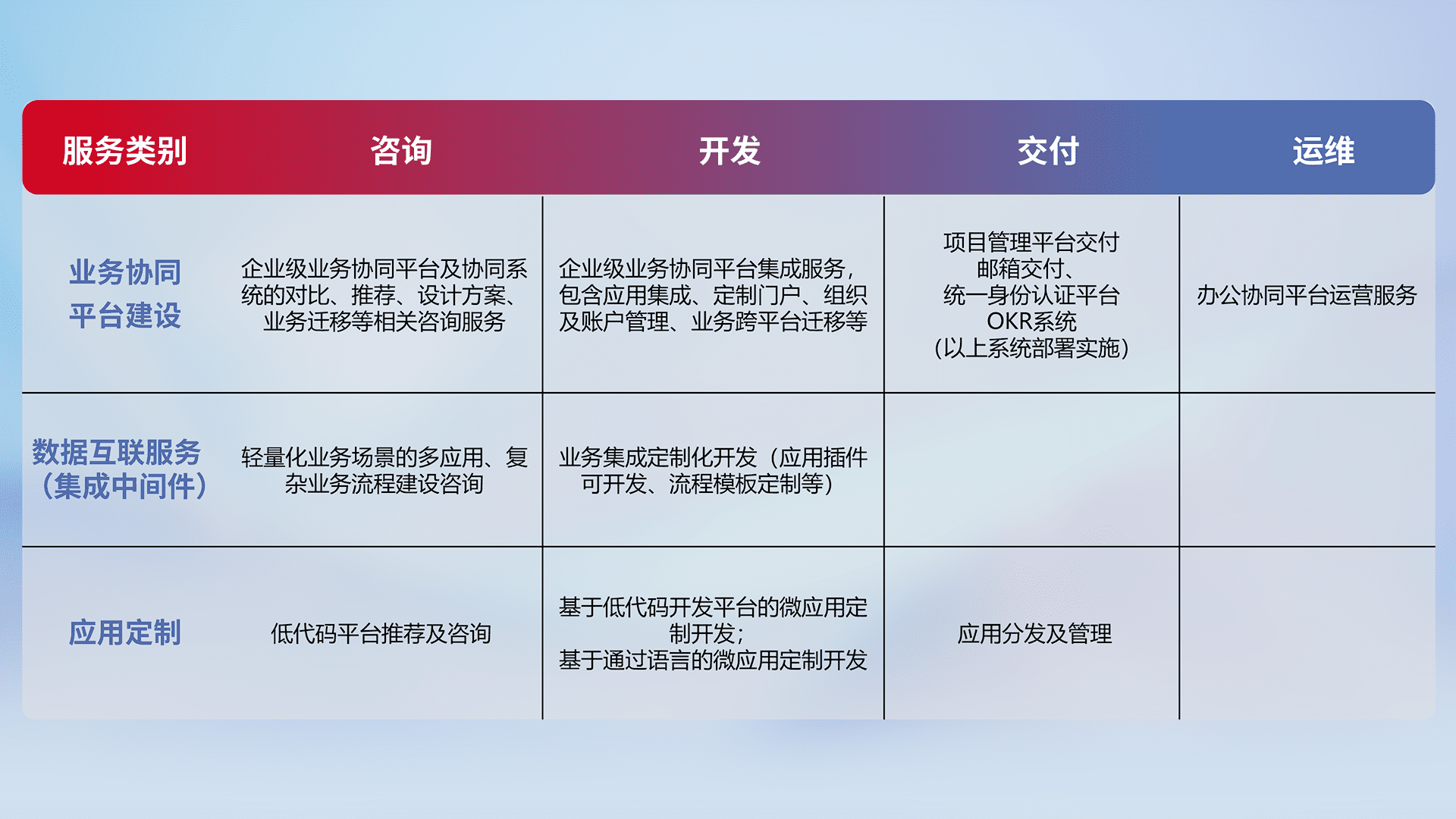 针对钉钉、、、企微、、、IDaas等平台级产品提供产品的规划、、、方案、、、交付、、、定制化开发等服务,,,实现如统一协同办公、、智能客户服务、、混合会议管理、、、智能数据查询、、等业务场景,,实现数字化转型。。。。