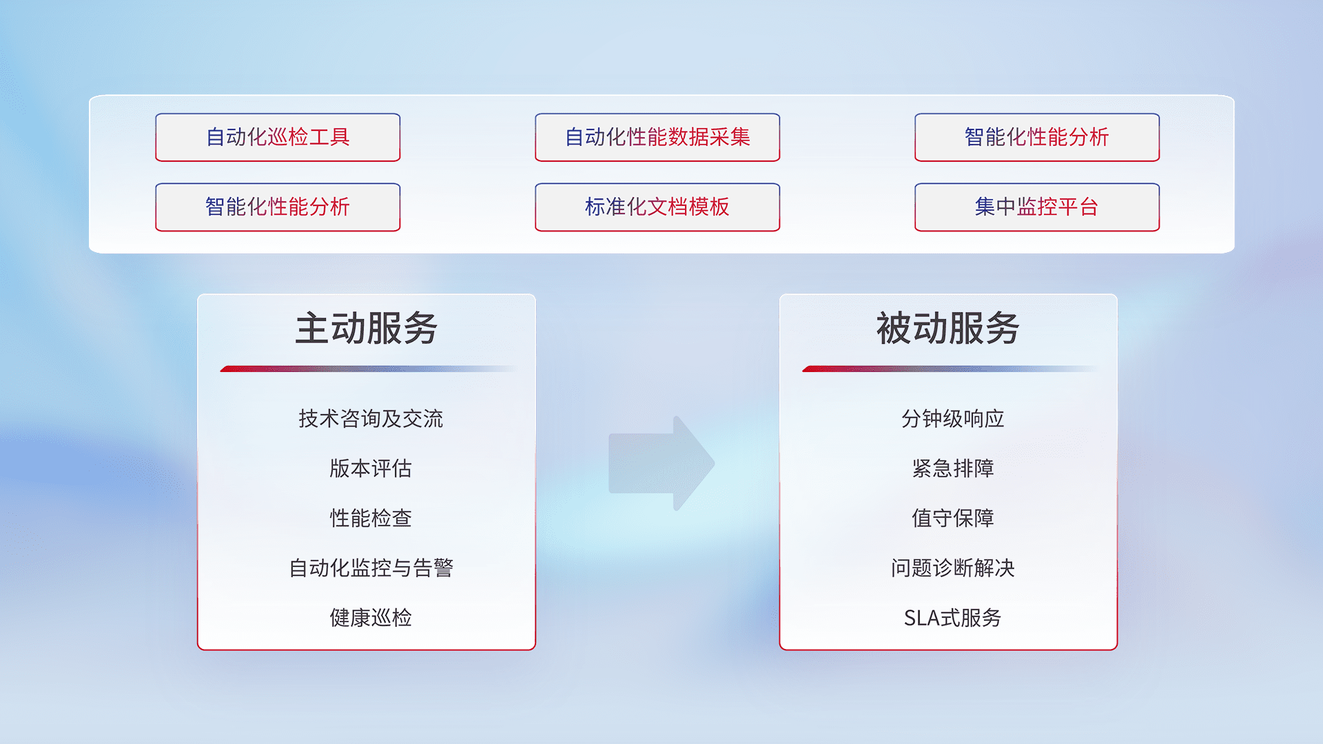 智能化工具和标准化文档,,,保障服务质量,,,提供主动服务(包含技术咨询、、、、版本评估、、、、性能检查、、、、自动化监控与告警、、健康巡检)和被动服务包含(分钟级响应、、紧急排障、、、值守保障、、问题诊断解决、、SLA服务)。。。。